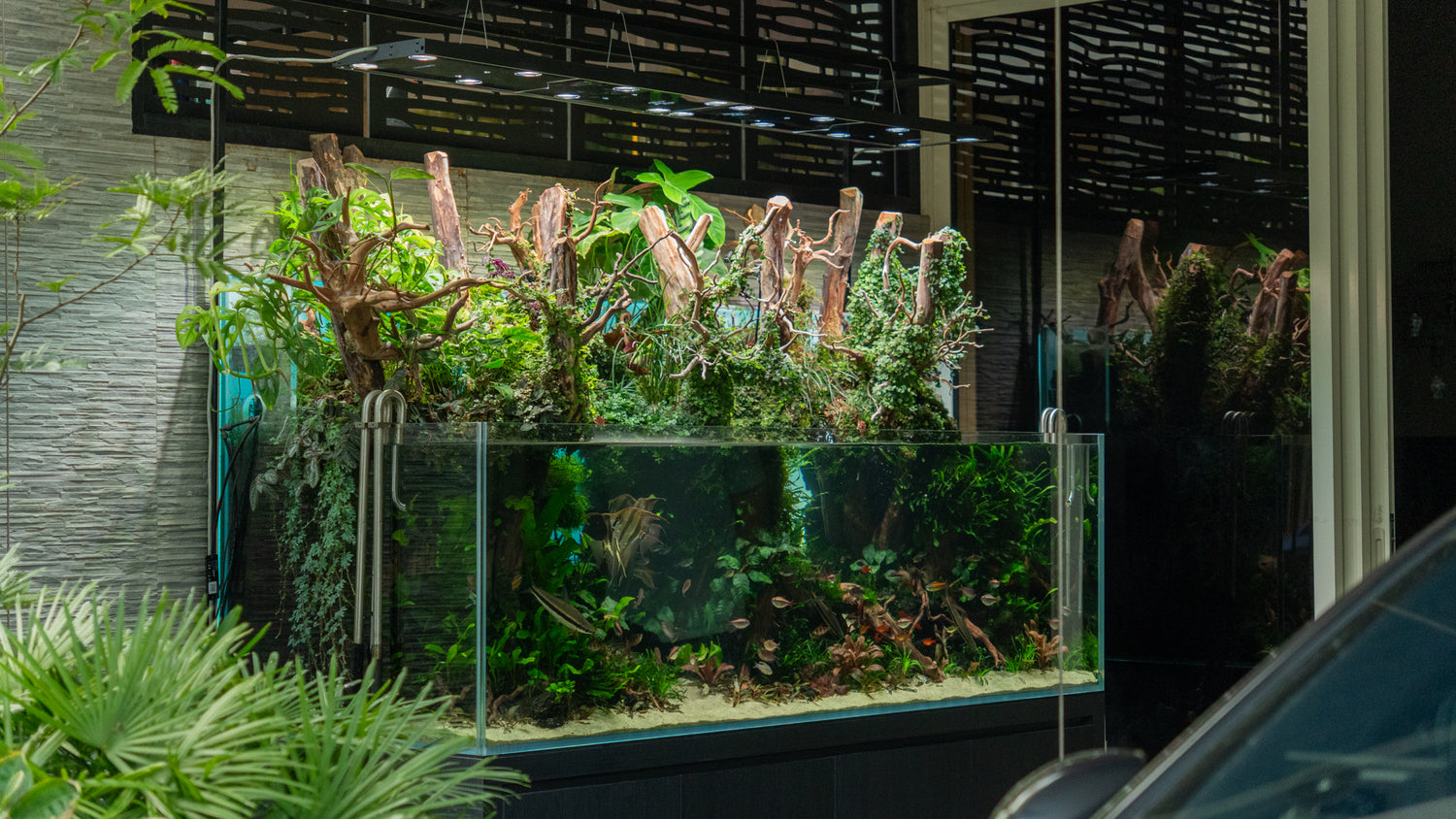 This custom office aquarium combines strategic plant selection with advanced filtration and lighting systems to create a largely self-sustaining aquarium.