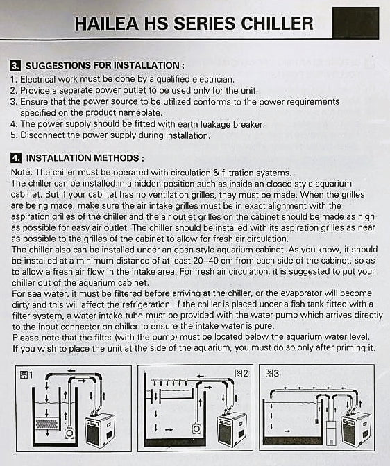 - For use with marine setups, it is recommended to install the chiller after the filtration systems. This is to ensure the durability and function of the evaporator.