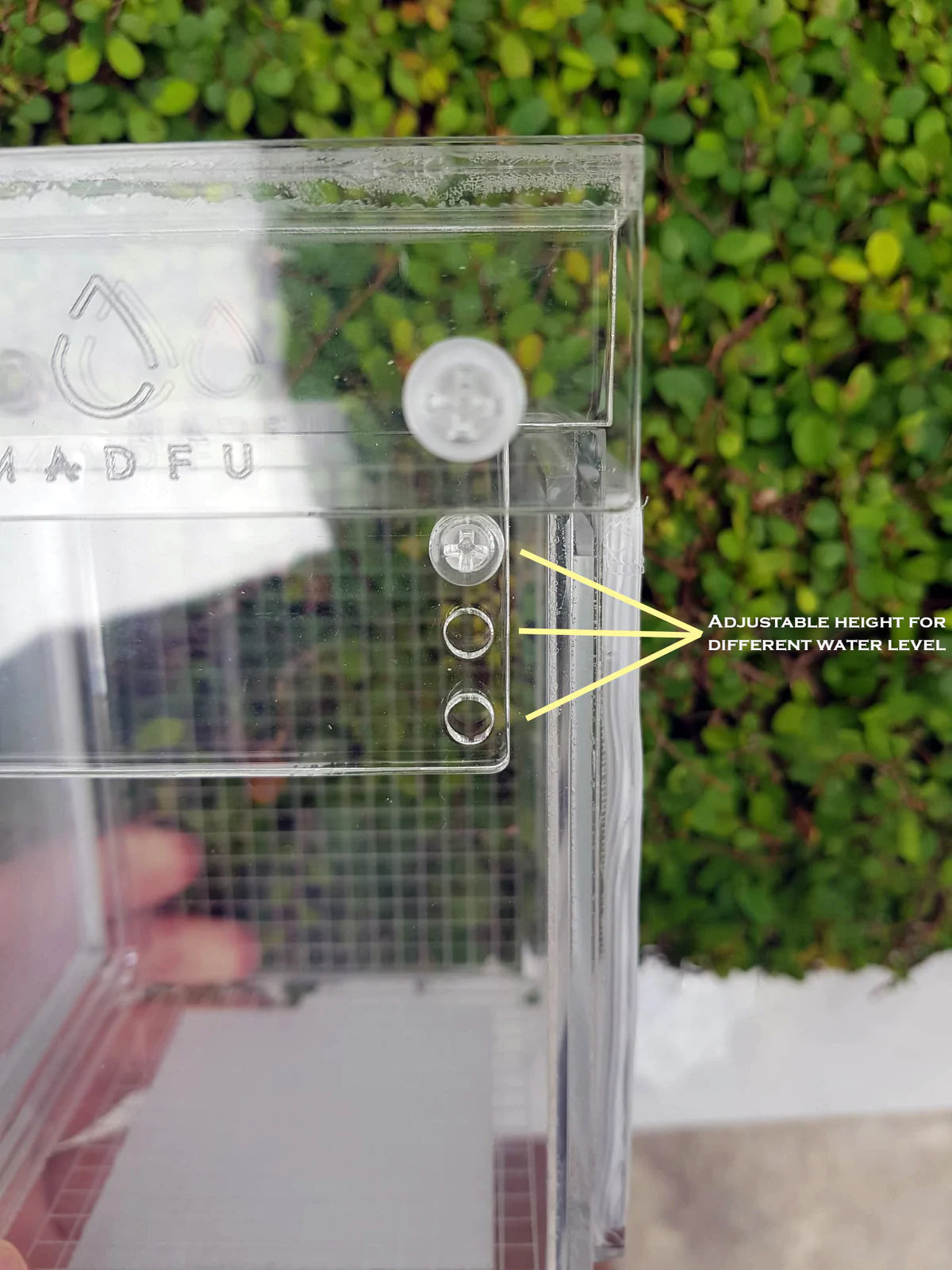 This hand made acrylic breeder box is perfect for selective breeding and culling. The breeder box is fitted with nets on the both side to aid with circulation. The breeder box now comes with adjustable height for different tank water level.